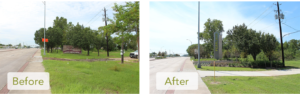 Entryway at Beltway 8 – Two 24’ Pearland monument signs, planter walls with stone veneer, landscaping, and irrigation were installed on both sides of the road at Beltway 8.