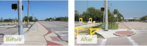 Broadway Intersection – 18’ Pearland signs were installed on the northeast and southwest corners and all four corners were upgraded with new pedestrian plazas and ramps, seat walls, landscaping and irrigation.