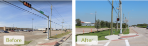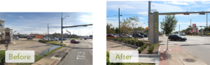 Enhanced Pedestrian Plazas – Pedestrian areas were reshaped, enlarged and enhanced with pavers at various intersections. McHard and Broadway intersections were upgraded with seat walls covered with stone veneer along the back of the paver plazas and Crape Myrtle trees and shrubs were planted along the back of the seat wall.